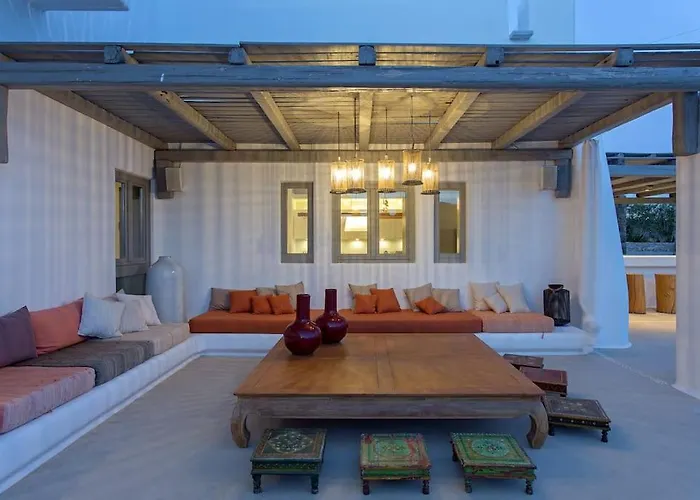 カラファティス ビーチから1.8km離れた所の場所に位置するベッドルーム5室のCasa Di Luna House Main カラファティスは、庭園の景色を望むテラスを提供しています。 プライベートなプールを提供するこの宿泊は、Mykonos Vioma Organic Farmから車で10分の場所にあります。